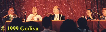 Peter was asked what kind of specialty he would have practiced had he continued in medicine. (Stan quickly answered "Gynecology".) He said that was difficult to say as if he could have made a choice he never would have gone into acting. He speculated in osteopathy, sports medicine or perhaps pediatrics. Which lead to the announcement, with suitable congratulations, that Peter and his wife Carolyn are expecting a baby. Peter said that once and for all it proves he is NOT immortal. He said they've been a bit nomadic, only spending several months in one place, but that now with the baby on the way they'll be settling down. Probably Canada near Carolyn's parents. He also told us a bit about an "Outer Limits" episode he's finished. Regarding Strange World and then Cold Feet Peter joked that casting him in a series was the kiss of death. He repeated his reluctance to be trapped in a series playing the same character episode after episode. He feels that all the creation of character happens in the first episode and then you just repeat the same thing. Very boring. EXCEPT when he talked about Methos. He said the exception was Methos. He never knew from one episode to the next who Methos was, he was always a surprise. He said he thought a Methos and Joe show was possible as it could involve others and not just be about them every week. (Gee.....now where have I heard that before?) Which leads me to believe that if Peter were offered a Methos show that was treated correctly, with the support and creative quality of Highlander, that he would accept it. I got the impression from both Bill and Peter that it would be a Methos and Joe show and that it would be more of an anthology show rather than Joe and Methos being the center of the show week after week. We'll see if my predictions come to pass. But my success rating is pretty high right now.