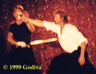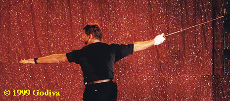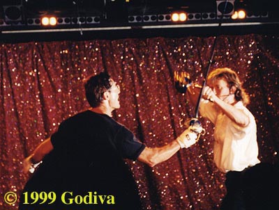 Near the end Bob solicited items from the audience to use in a duel against Anthony. He eventually chose a 'furby', a small stuffed toy. Anthony was using the new Highlander Colichemarde (gratuitious product placement). The rule was that if he could touch Anthony with the furby he could 'kill' him. Bob then had to parry Anthony's very large sharp sword and try to touch him with his little furby. Quite hilarious. And in the end......the furby bit Anthony on the leg. Bob won!
